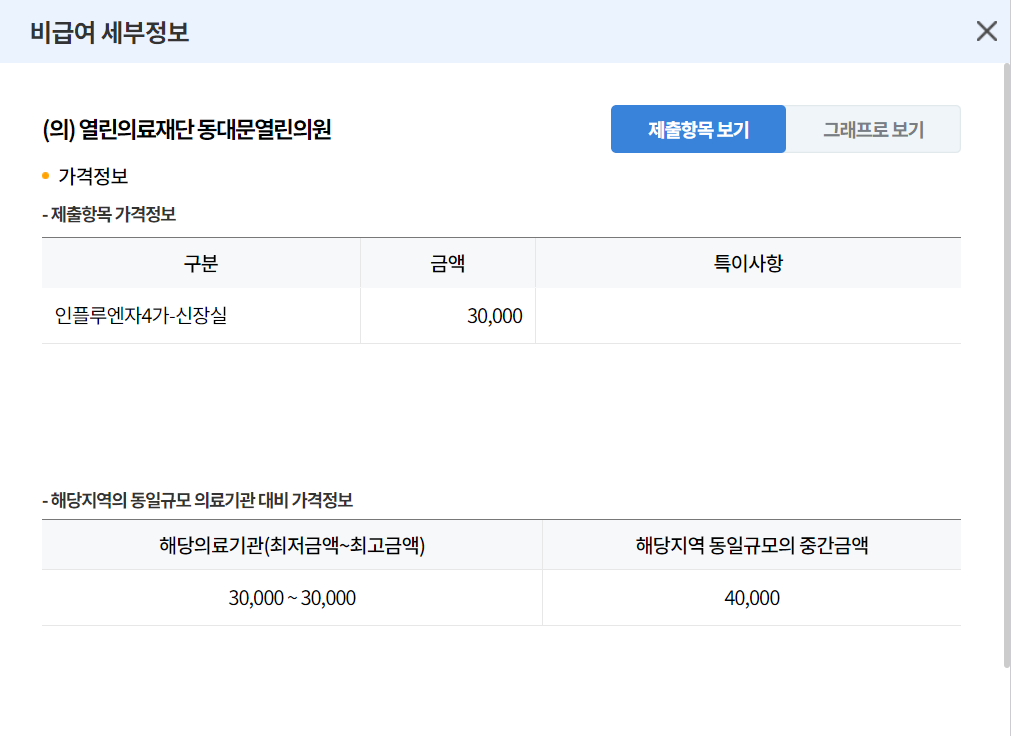 들어 가시면 아래 사진과 같이 지역, 의료기관, 명칭, 진료비 항목이 나와있습니다. 지역에 사시는 거주지역을 선택 한 후 비급여 진료비 항목에 독감을 기입 해주셔야 합니다. 독감을 기입후 상세 분야를 예방접종료를 선택을 해서 검색을 해주면 아주 간단하게 나옵니다